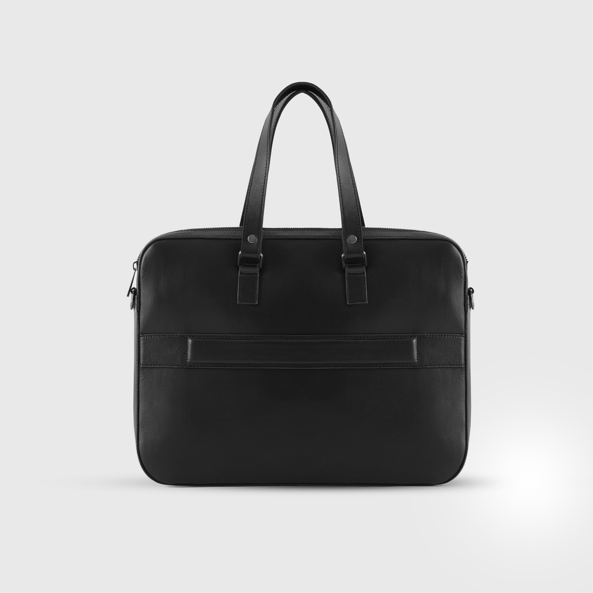Crafted in supple black leather, the bag offers a structured silhouette with a softly grained texture. The interior features a divided, padded compartment for secure laptop storage, alongside a zipped pocket for smaller essentials. A discreet back strap allows for effortless placement on trolley handles, making it an ideal travel companion. Finished with refined handles and a detachable leather shoulder strap.